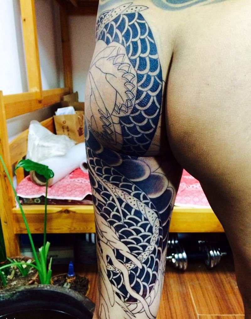 • T网红王老大花腿龙纹身图片_腿部新传统纹身图案
