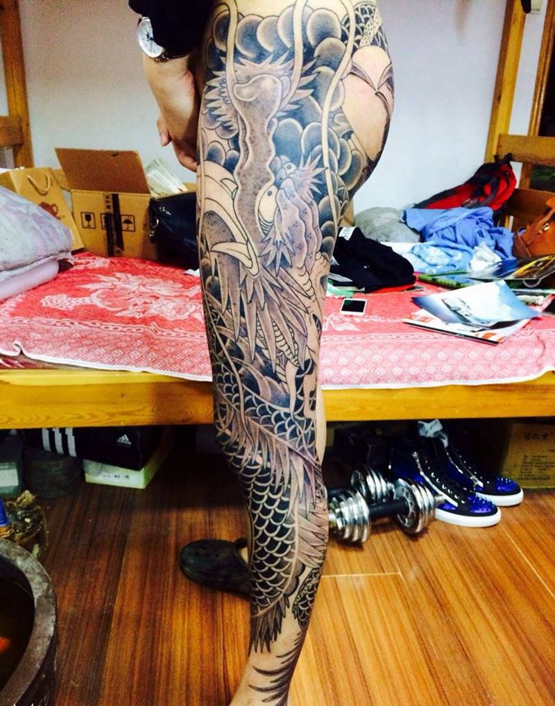 • T网红王老大花腿龙纹身图片_腿部新传统纹身图案