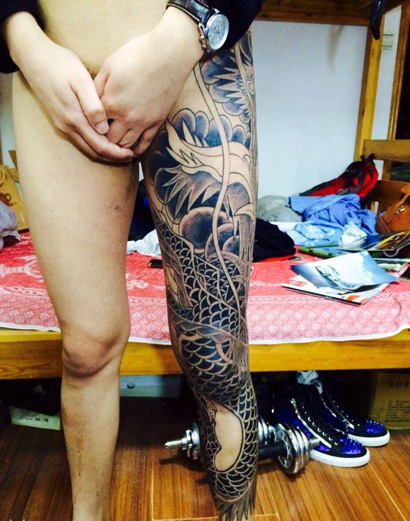 • T网红王老大花腿龙纹身图片_腿部新传统纹身图案