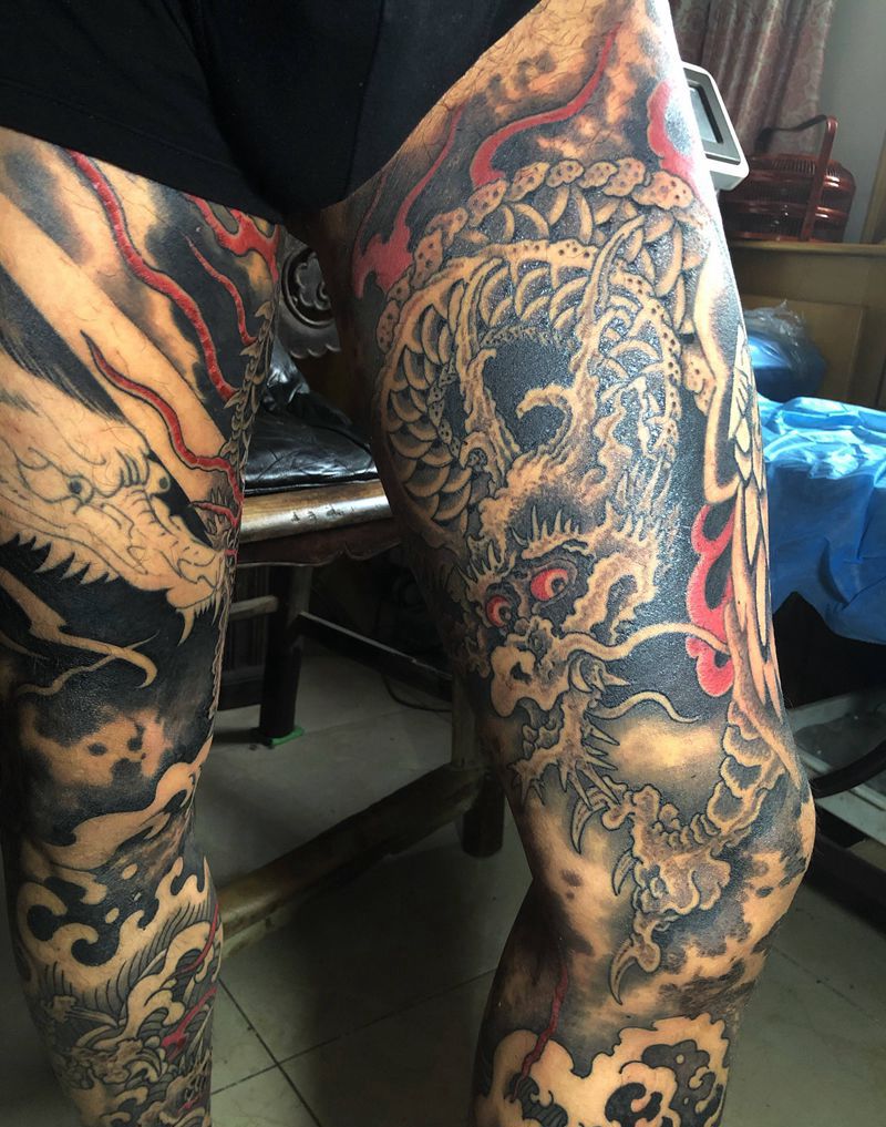 • T网红王老大花腿龙纹身图片_腿部新传统纹身图案