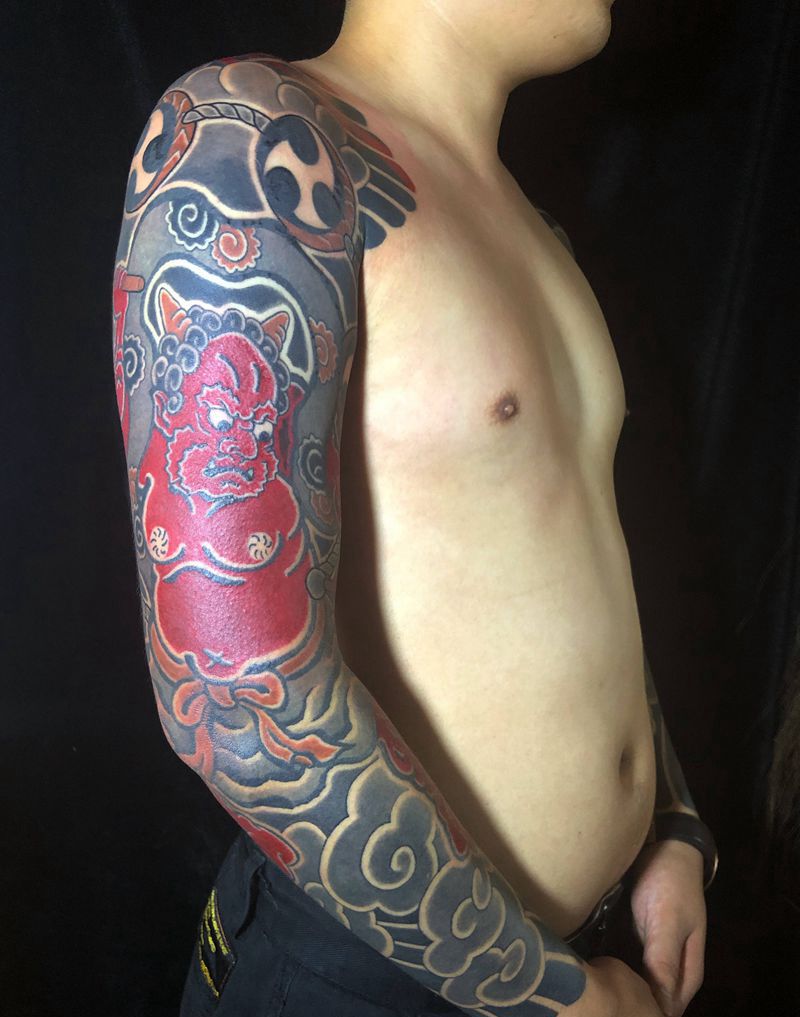 当前位置: 首页 >天津市纹身店-同義誠刺青處纹身图案>風雷二神纹身图片_手臂老传统纹身图案