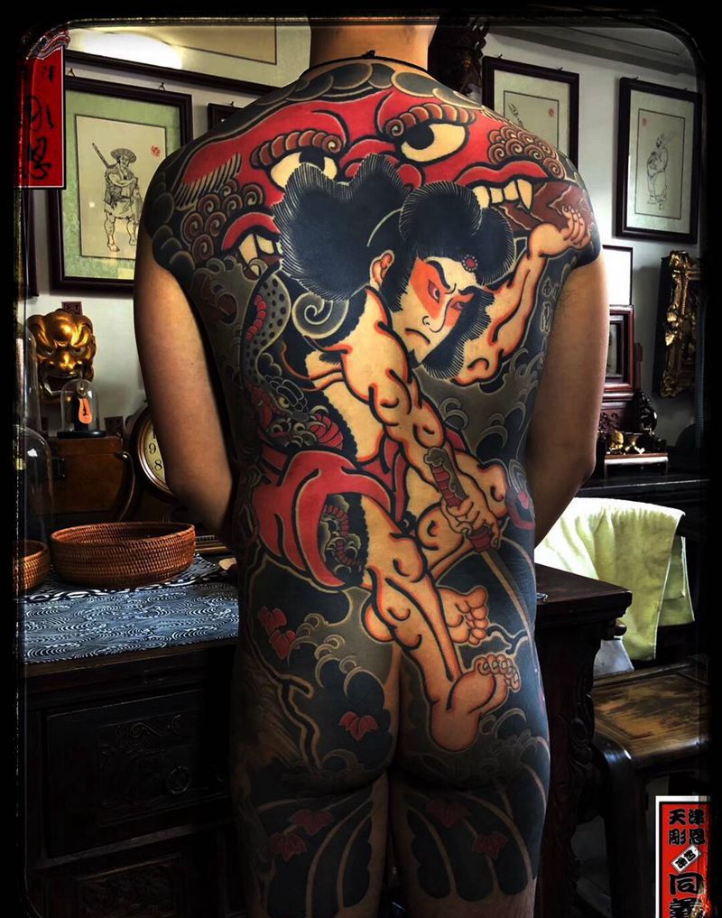 当前位置: 首页 >天津市纹身店-同義誠刺青處纹身图案>近期作品纹身图片_背部腿部老传统水墨纹身图案
