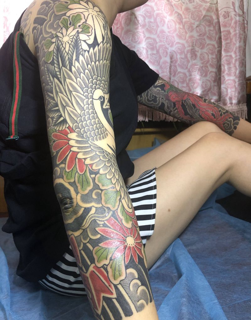 当前位置: 首页 >天津市纹身店-同義誠刺青處纹身图案>女士花臂(未完成)l纹身图片_手臂肩部老传统纹身图案