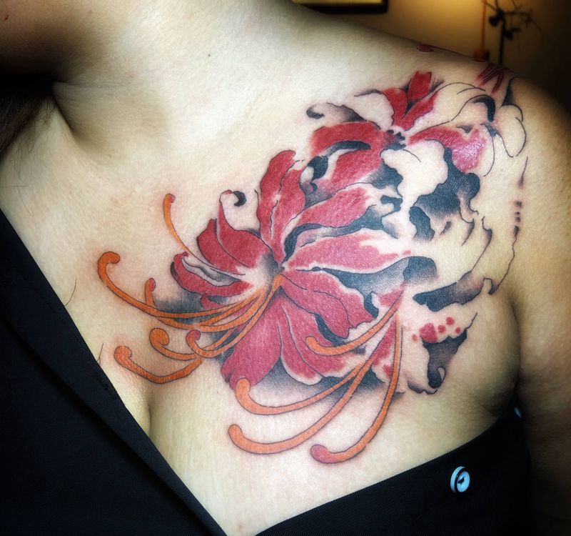 彼岸花開纹身图片_胸部水墨水彩纹身图案