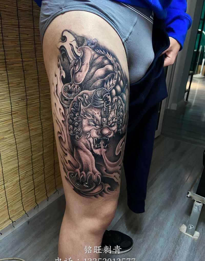 貔貅纹身图片_腿部老传统纹身图案