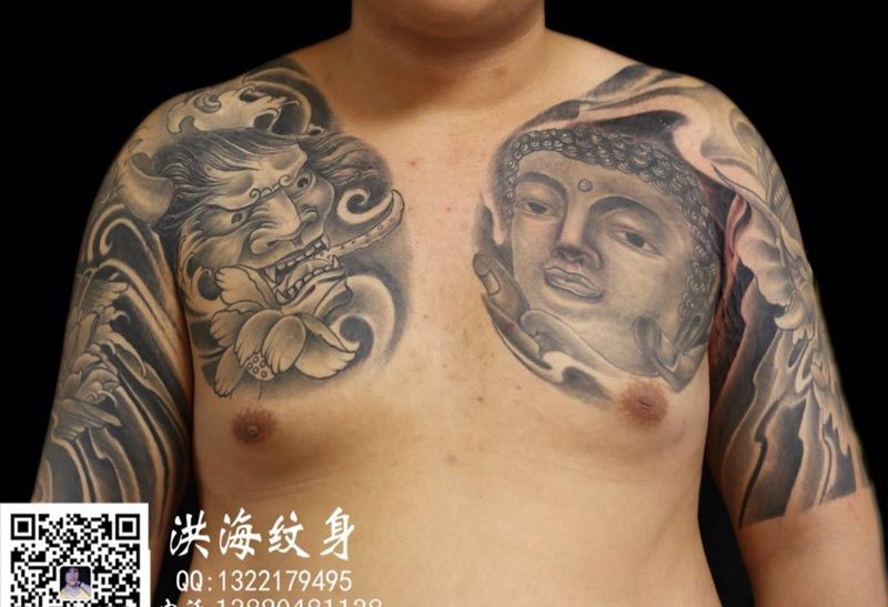 双半胛纹身图片_成品胸部肩部传统动物人物鬼神纹身图案