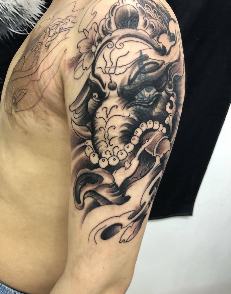 当前位置: 首页 >天津市纹身店-颜刺青纹身TATTOO纹身图案>半甲象神遮盖纹身图片_胸部手臂老传统纹身图案