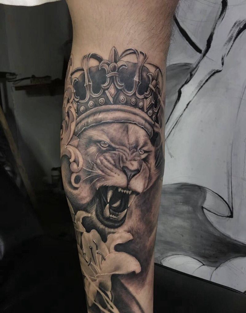 当前位置: 首页 >天津市纹身店-天津·罕古刺青纹身图案>狮王 象神 小腿纹身图片_