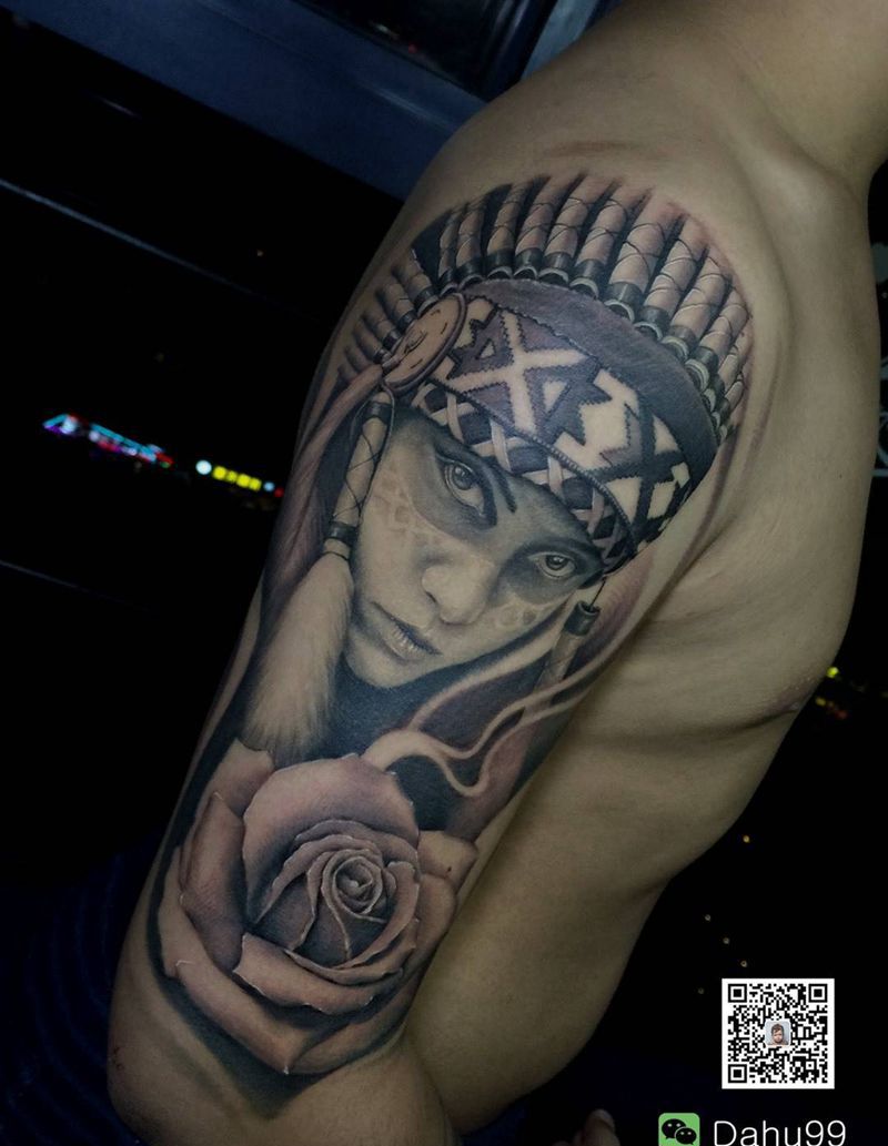 当前位置: 首页 >天津市纹身店-天津·罕古刺青纹身图案>最后的莫西干纹身图片_手臂肩部欧美写实肖像黑白纹身图案