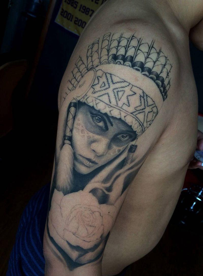 当前位置: 首页 >天津市纹身店-天津·罕古刺青纹身图案>最后的莫西干纹身图片_手臂肩部欧美写实肖像黑白纹身图案