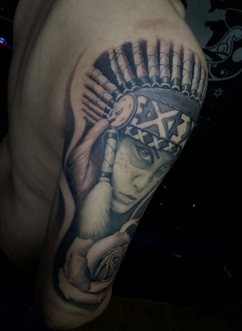 当前位置: 首页 >天津市纹身店-天津·罕古刺青纹身图案>最后的莫西干纹身图片_手臂肩部欧美写实肖像黑白纹身图案