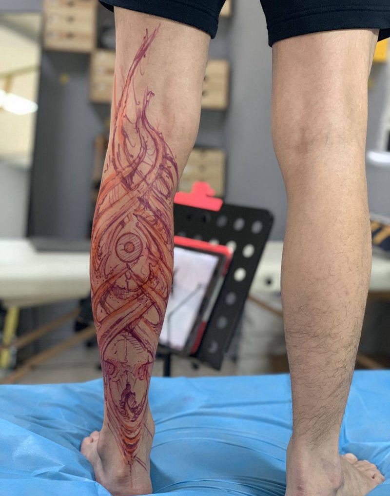 • T网红王老大花腿龙纹身图片_腿部新传统纹身图案