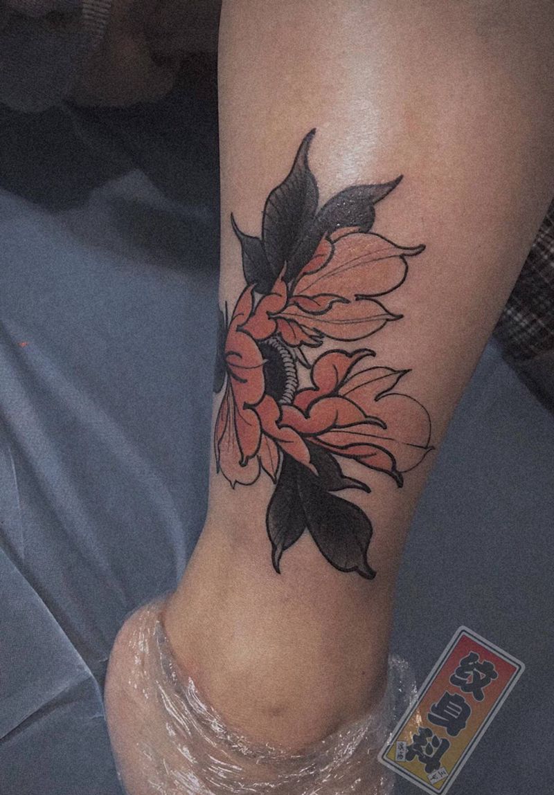 牡丹遮盖纹身图片_腿部新传统牡丹花遮盖纹身图案
