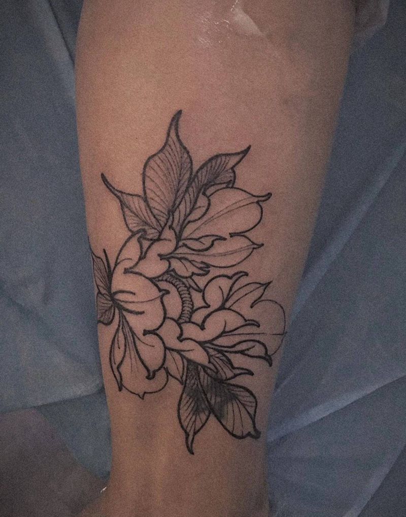 牡丹遮盖纹身图片_腿部新传统牡丹花遮盖纹身图案