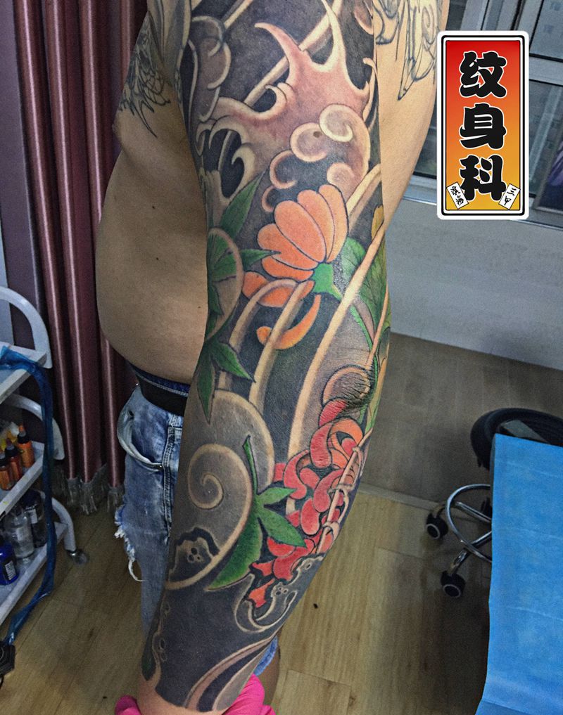 当前位置: 首页 >天津市纹身店-滨海纹身科纹身图案>旧纹身变日式花臂,纹身图片_手臂老传统菊花日式花臂纹身图案