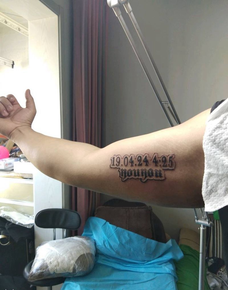 当前位置: 首页 >天津市纹身店-滨海纹身科纹身图案>简单的出生日期纹身图片_手臂花体字纹身图案