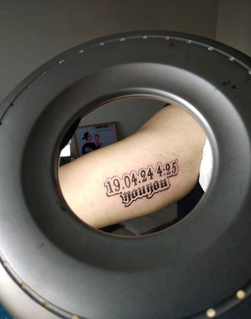 当前位置: 首页 >天津市纹身店-滨海纹身科纹身图案>简单的出生日期纹身图片_手臂花体字纹身图案