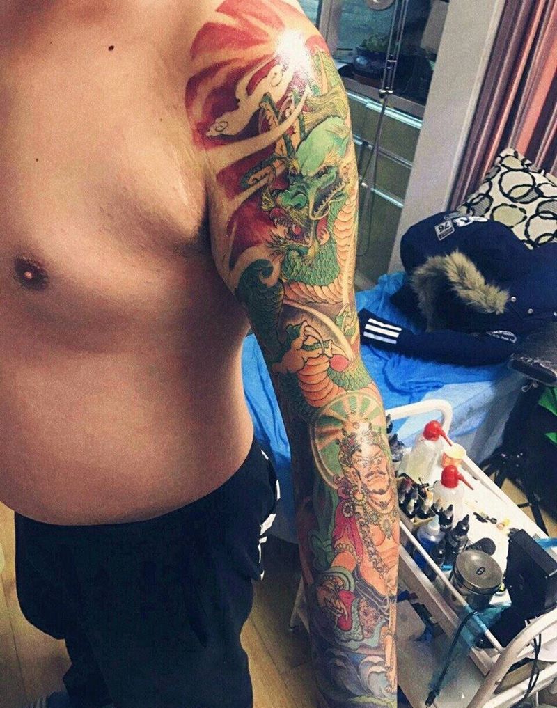 当前位置: 首页 >天津市纹身店-滨海纹身科纹身图案>重彩传统花臂纹身图片_手臂老传统龙,黄财神纹身图案
