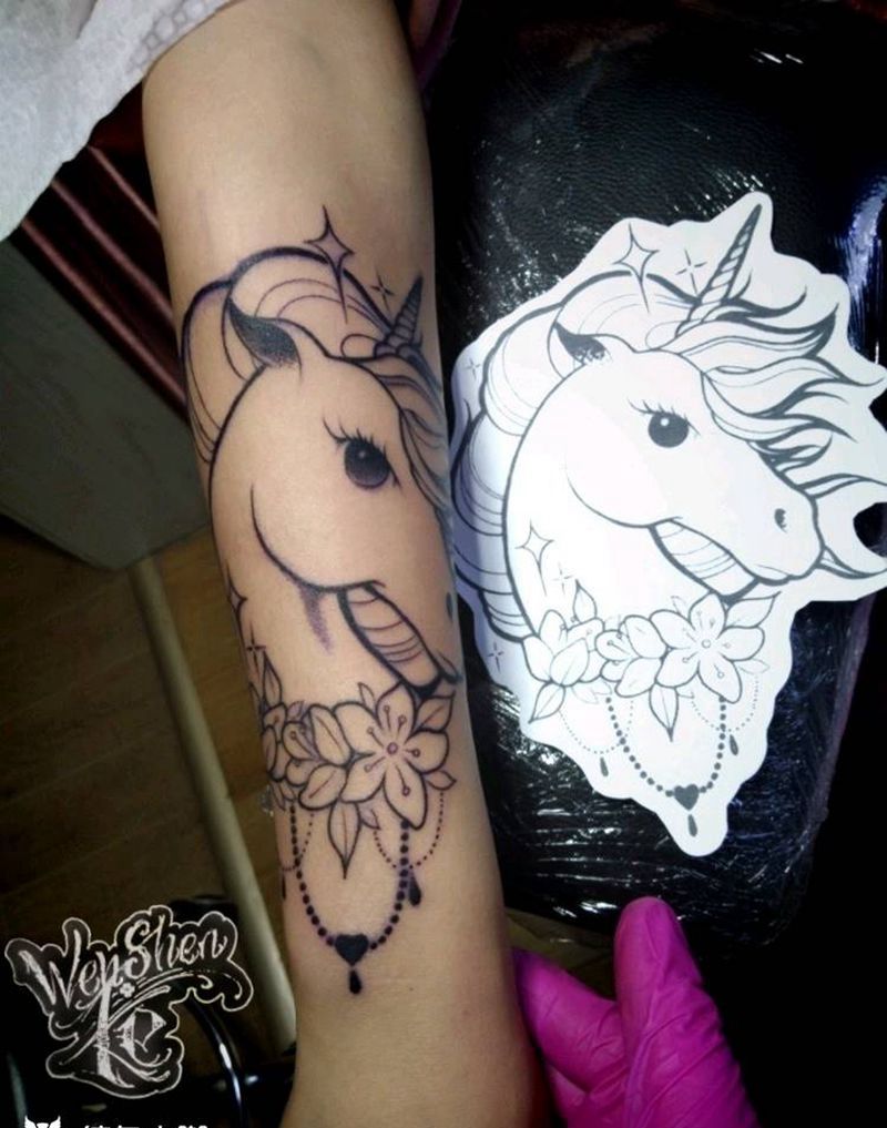 独角兽纹身图片_手臂点刺New School独角兽纹身图案