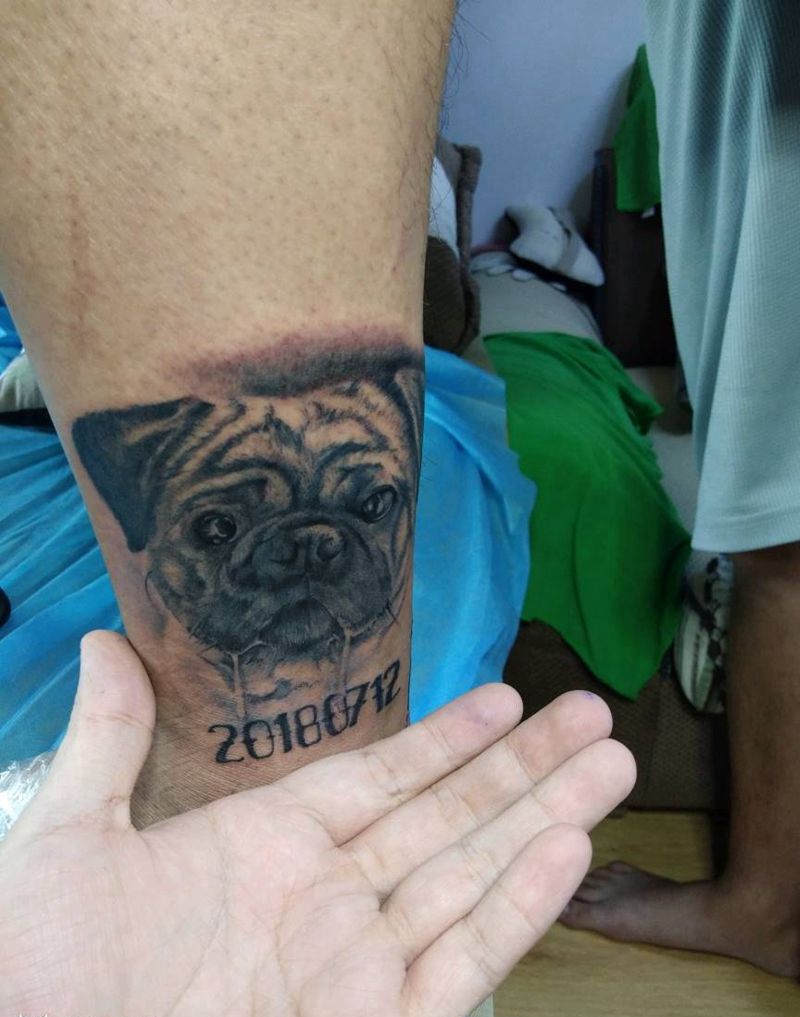 小狗加转经轮(纪念亡友)纹身图片_腿部欧美写实狗狗纹身图案