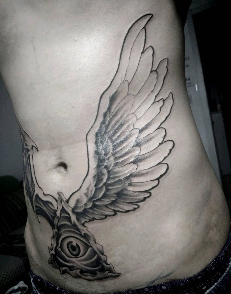 又一个手绘翅膀,先做一半纹身图片_腰部欧美写实翅膀上帝之眼纹身图案