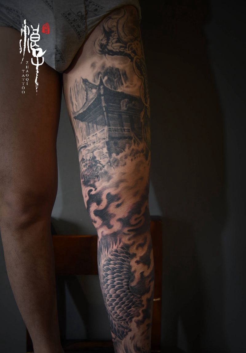• T网红王老大花腿龙纹身图片_腿部新传统纹身图案