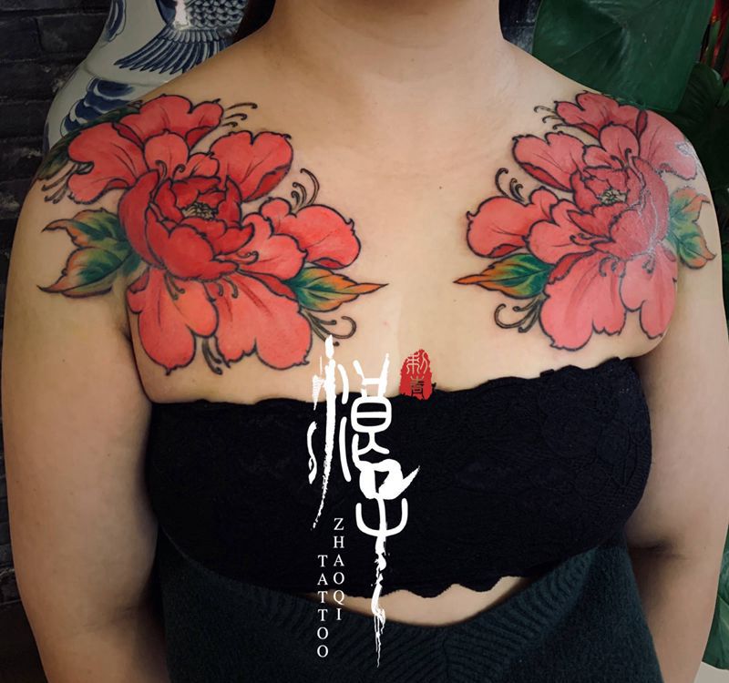 富贵牡丹纹身图片_胸部新传统牡丹花纹身图案