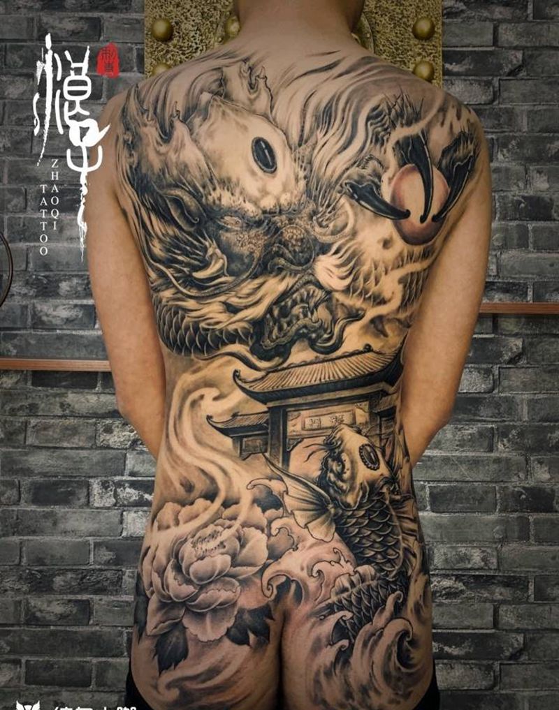 《化龙》纹身图片_背部新传统龙鱼跃龙门纹身图案