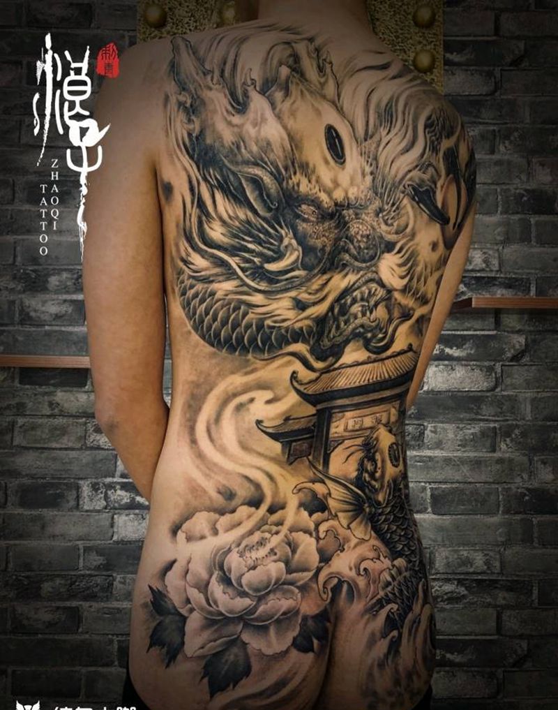 《化龙》纹身图片_背部新传统龙鱼跃龙门纹身图案