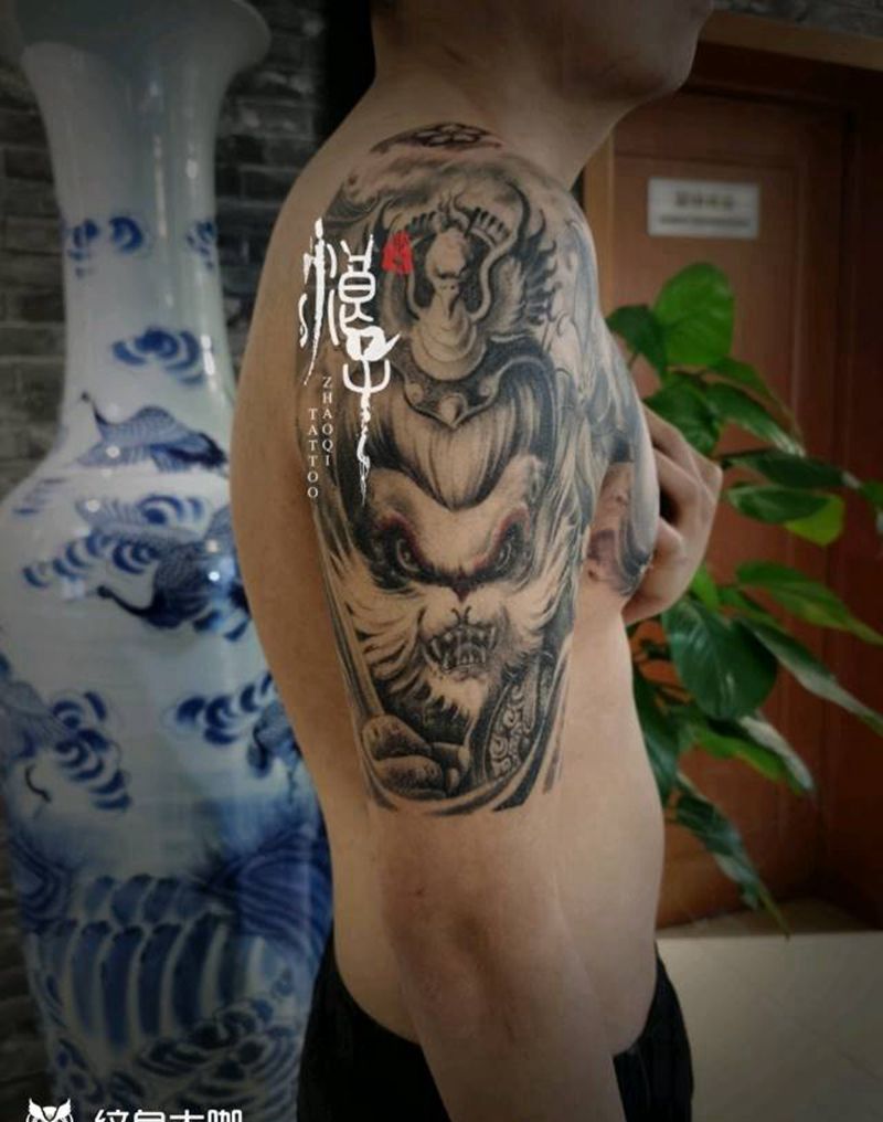 佛缘纹身图片_胸部手臂新传统佛孙悟空文殊菩萨纹身图案