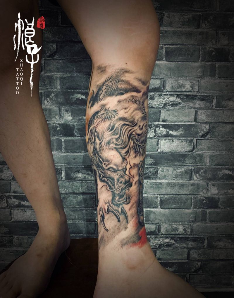 • T网红王老大花腿龙纹身图片_腿部新传统纹身图案