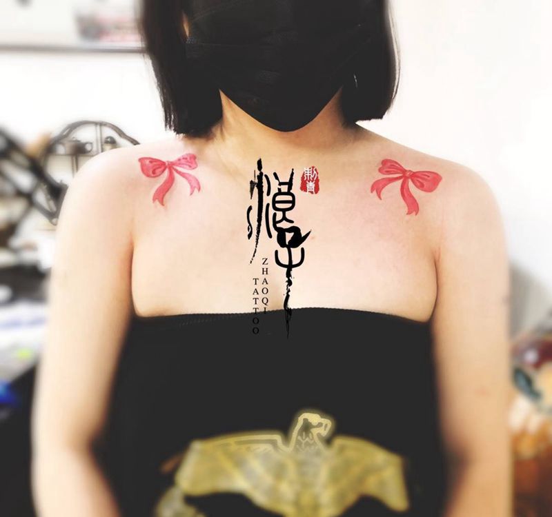 美女蝴蝶结纹身图片_肩部水彩水墨纹身图案