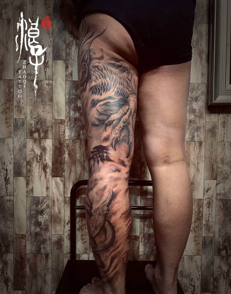• T网红王老大花腿龙纹身图片_腿部新传统纹身图案
