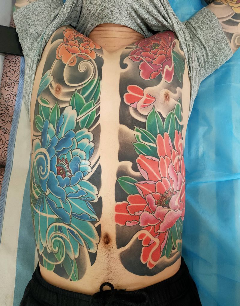 牡丹开衫纹身图片_胸部老传统纹身图案