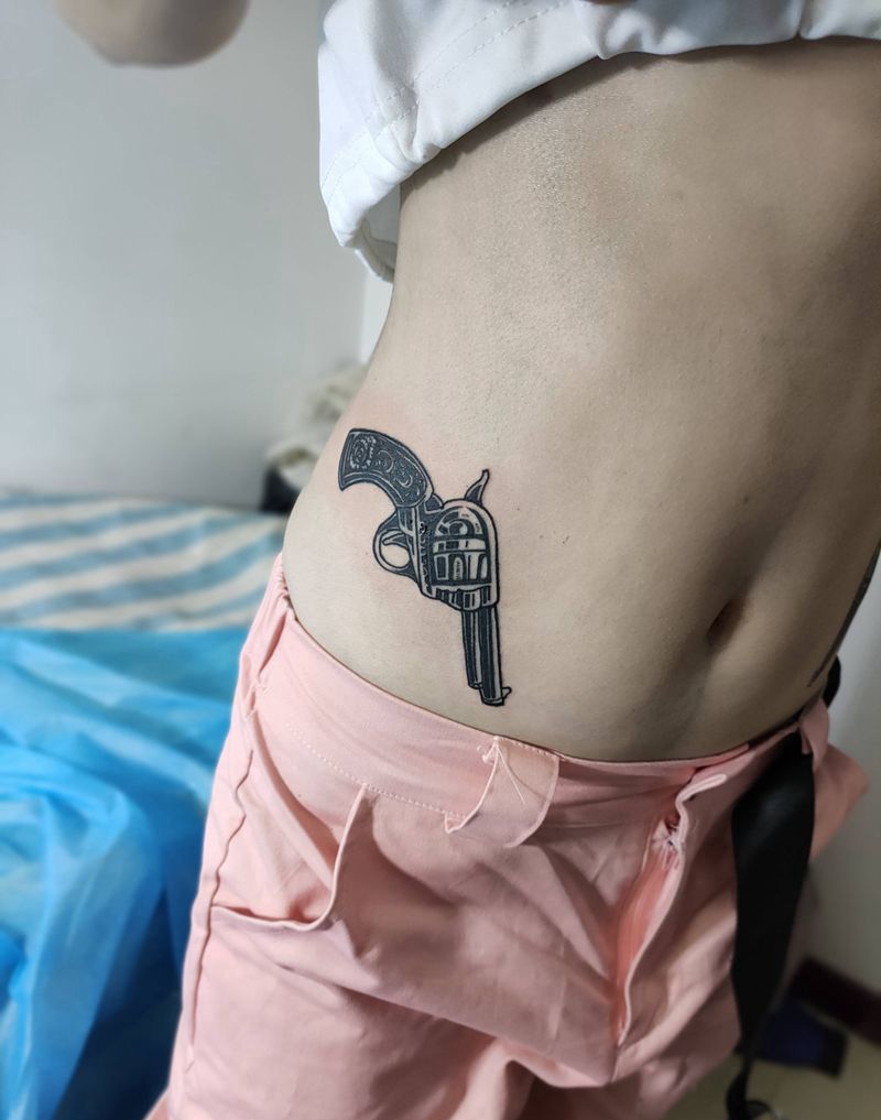 当前位置: 首页 >天津市纹身店-缘刺青纹身图案>双枪纹身图片_腹部New School纹身图案