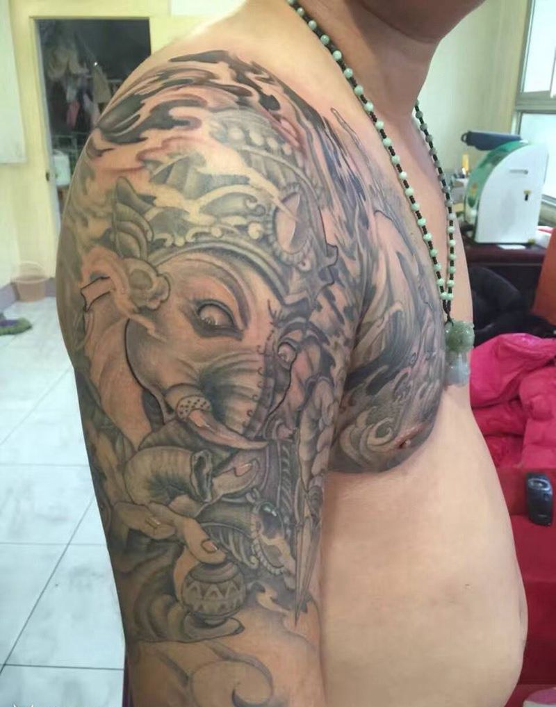 当前位置: 首页 >天津市纹身店-缘刺青纹身图案>半甲 般若+象神纹身图片_