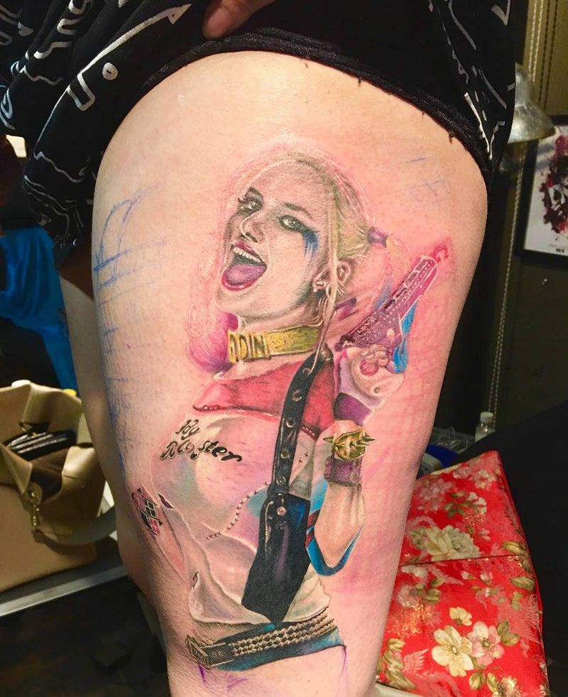 当前位置: 首页 >天津市纹身店-圣堂纹身馆纹身图案>小丑女纹身图片_成品腿部宗教欧美肖像写实人物纹身图案