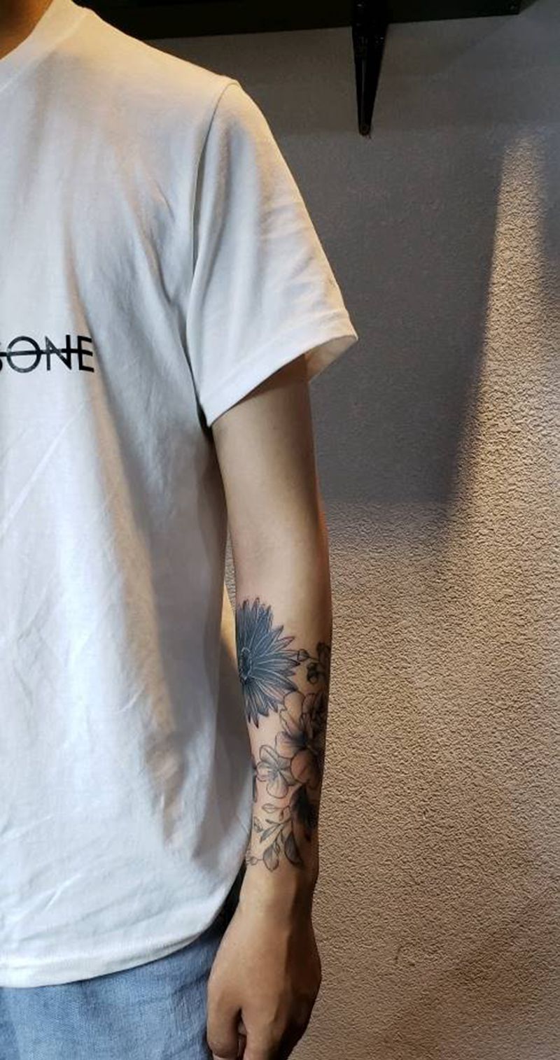 当前位置: 首页 >河北省石家庄市纹身店-林玖刺青纹身纹身图案>小臂素花遮盖纹身图片_手臂手部点刺New School向日葵素花遮盖纹身图案