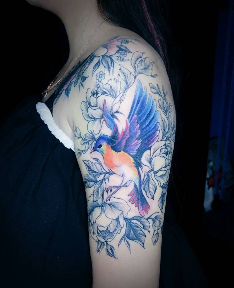 当前位置: 首页 >河北省石家庄市纹身店-林玖刺青纹身纹身图案>喜欢梦幻一点的美女纹身图片_肩部手臂点刺欧美写实素花蜂鸟花纹身图案