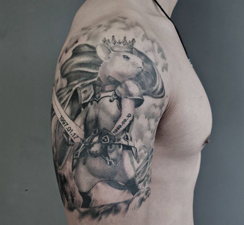当前位置: 首页 >河北省石家庄市纹身店-合一刺青纹身图案>鼠武士纹身图片_手臂腿部欧美写实老传统老鼠武士大臂纹身纹身图案