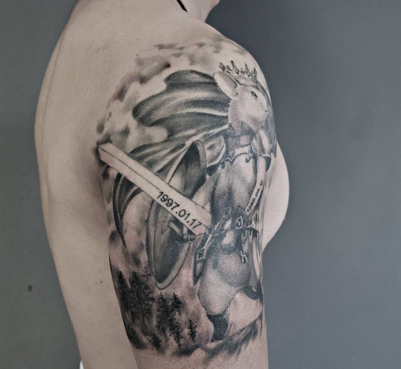 当前位置: 首页 >河北省石家庄市纹身店-合一刺青纹身图案>鼠武士纹身图片_手臂腿部欧美写实老传统老鼠武士大臂纹身纹身图案
