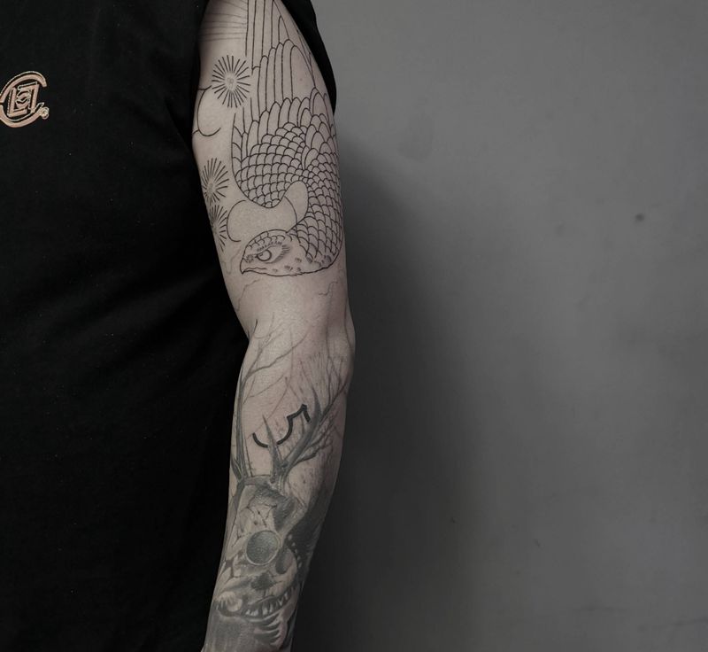 当前位置: 首页 >河北省石家庄市纹身店-合一刺青纹身图案>衔接花臂/修改/遮盖纹身图片_手臂背部老传统欧美写实鹰花臂老传统鹰纹身图案