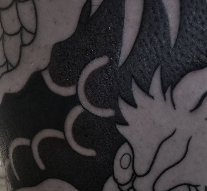 今日雾面纹身图片_背部腿部老传统新传统龙圆针打雾花腿纹身图案