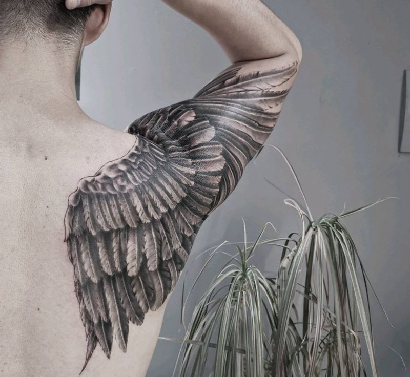当前位置: 首页 >河北省石家庄市纹身店-合一刺青纹身图案>羽翼纹身图片_手臂背部欧美写实点刺翅膀满背羽毛纹身图案