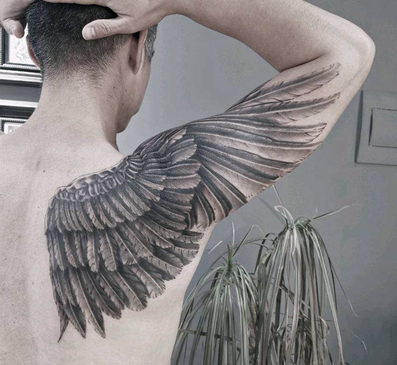 当前位置: 首页 >河北省石家庄市纹身店-合一刺青纹身图案>羽翼纹身图片_手臂背部欧美写实点刺翅膀满背羽毛纹身图案