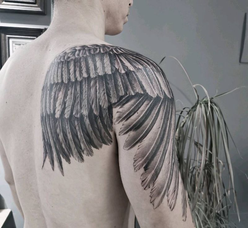 当前位置: 首页 >河北省石家庄市纹身店-合一刺青纹身图案>羽翼纹身图片_手臂背部欧美写实点刺翅膀满背羽毛纹身图案