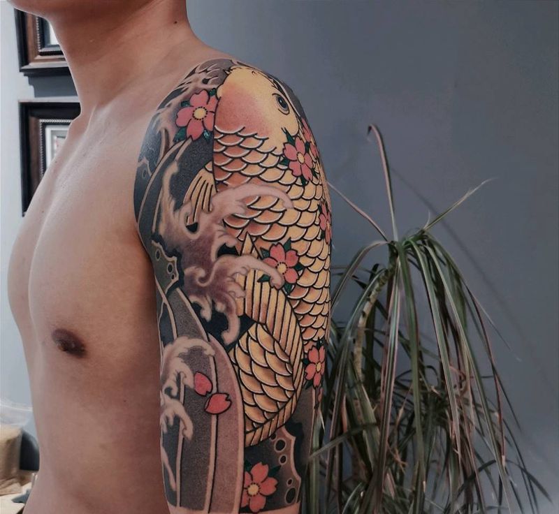 当前位置: 首页 >河北省石家庄市纹身店-合一刺青纹身图案>包大臂锦鲤纹身图片_手臂背部老传统新传统鱼浪大臂纹身纹身图案