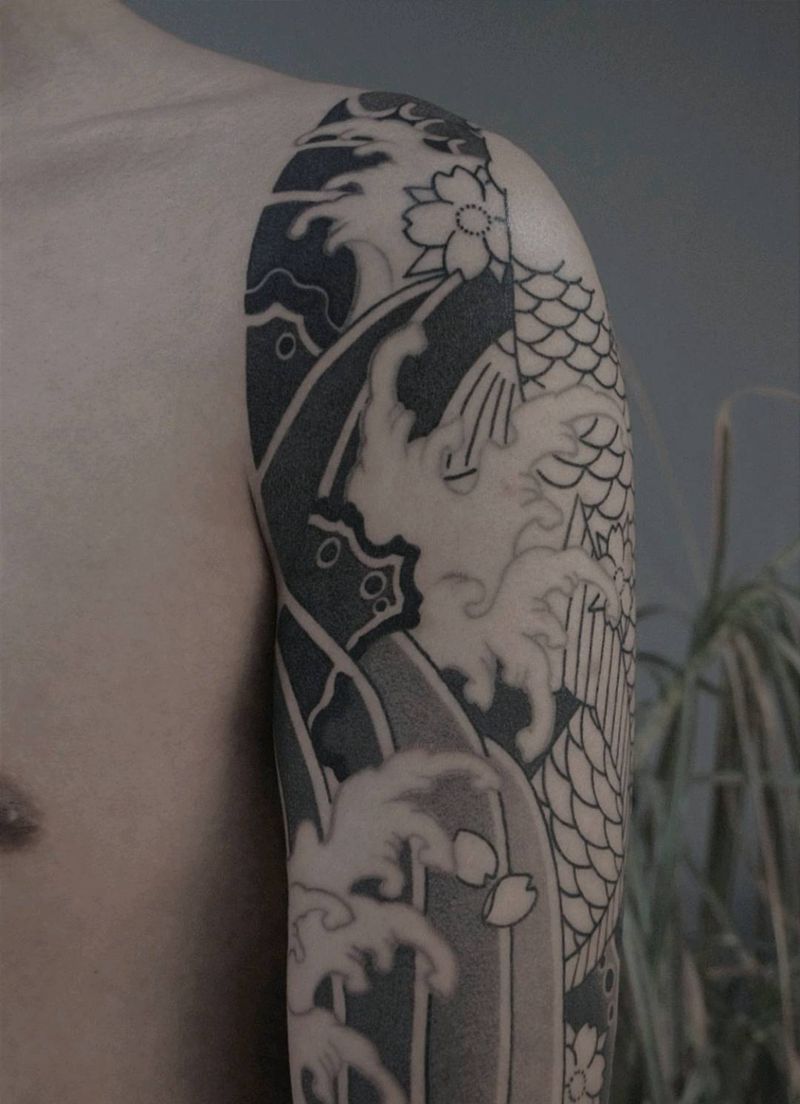 锦鲤包大臂进度纹身图片_手臂背部老传统新传统鱼浪日式纹身图案