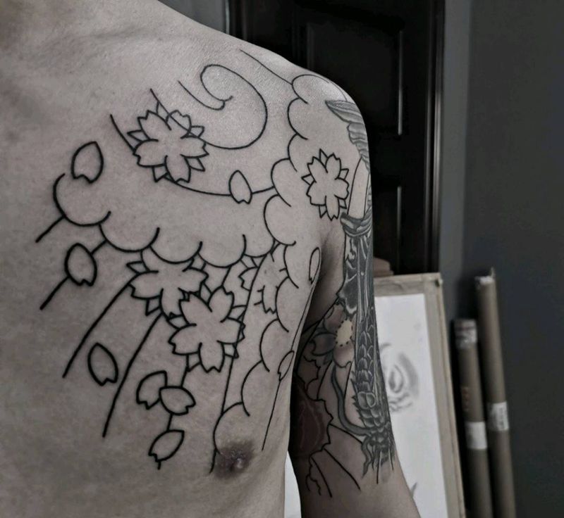 大臂衔接半甲未完成纹身图片_胸部手臂老传统新传统樱花老传统纹身半甲纹身图案