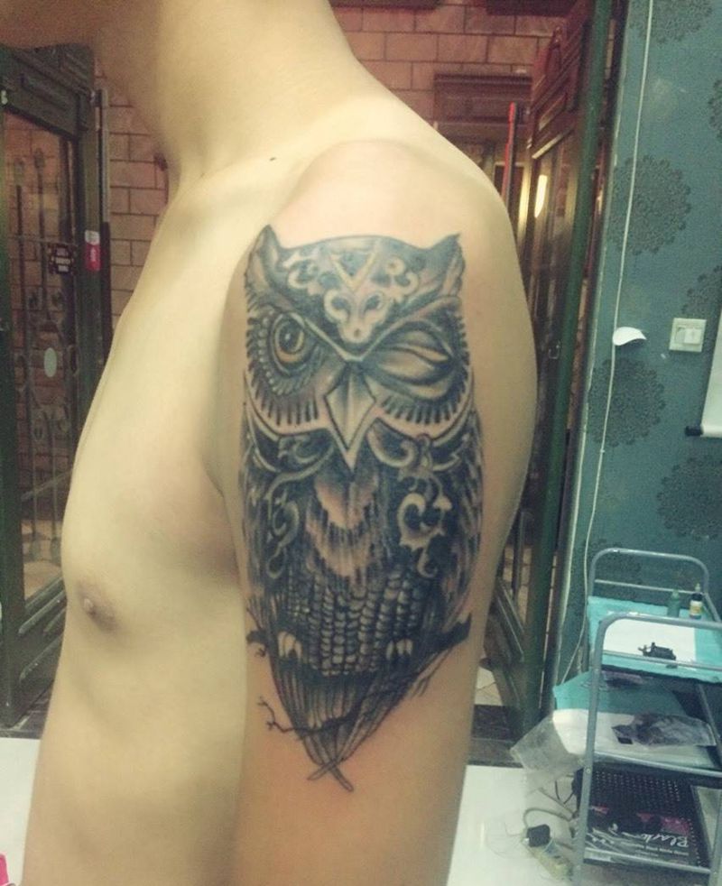 当前位置: 首页 >河北省石家庄市纹身店-李磊刺青会所纹身图案>大臂猫头鹰纹身图片